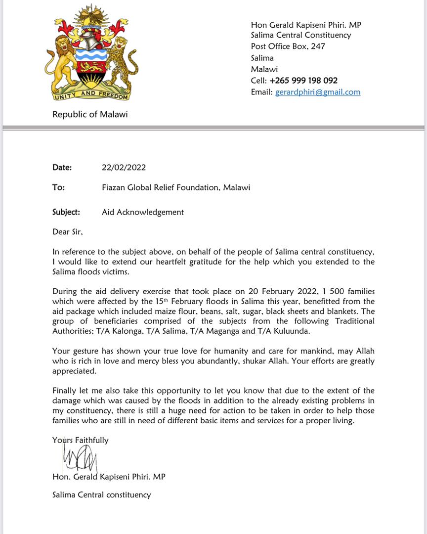 FGRF Malawi, worked hard during Cyclone ANA, and distributed aid among affected households of worth 0.25 million $.